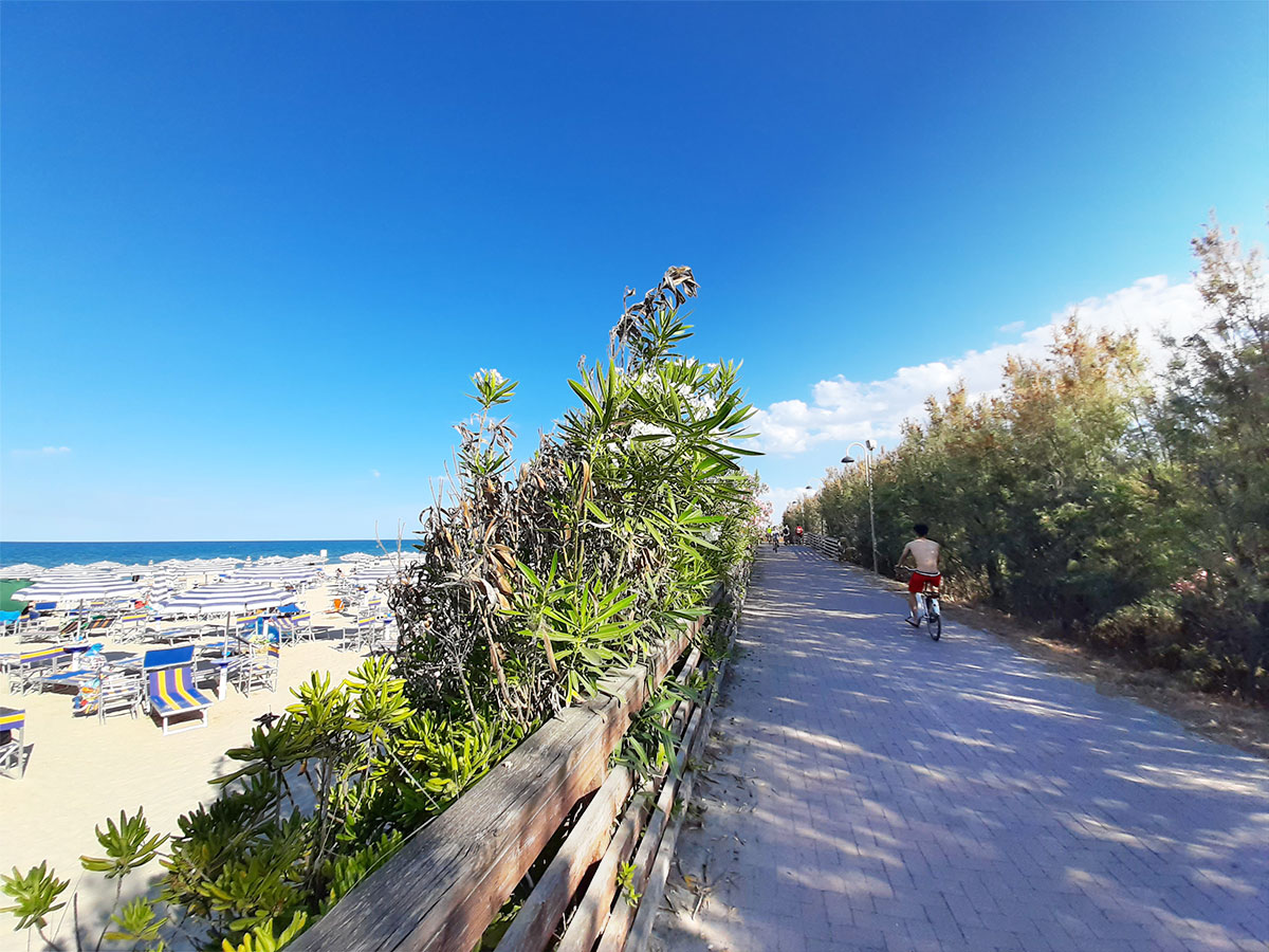 Splendida Residenza rifinita nei minimi dettagli, ideale per famiglie o coppie. Situata in posizione esclusiva, sulla pineta fronte mare, raggiungibile a piedi, offre comfort e relax per una permanenza indimenticabile.